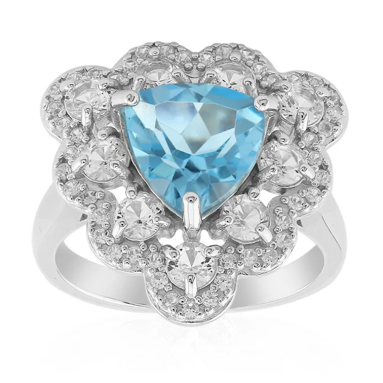 Anmutig und strahlend präsentiert sich dieser Ring mit einem atemberaubenden 2,559 ct. brasilianischen himmelblauen Topas mit Trilliant-Schliff für maximale Brillanz. Er wird elegant von einem Halo aus 45 funkelnden Zirkonsteinen und 9 weißen Topasen umrahmt, die ihm einen Hauch von anspruchsvollem Glamour verleihen. In hochglänzendem 925er Sterlingsilber gefasst, zieht dieses Schmuckstück mit seinem luxuriösen Farbton und den glitzernden Akzenten die Blicke auf sich. Es ist das perfekte Geschenk für besondere Anlässe und passt sowohl zur Alltags- als auch zur Abendgarderobe.