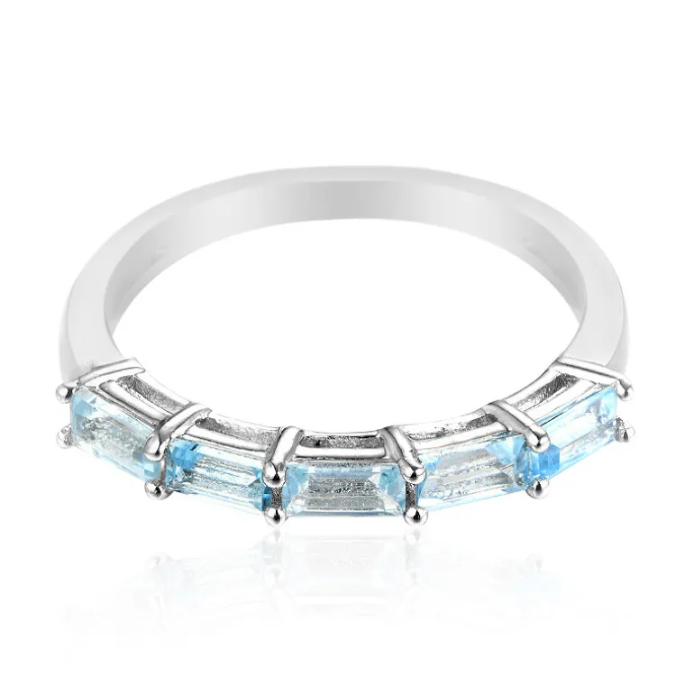 Dieser exquisite Ring besteht aus fünf himmelblauen Topasen, die aus Brasilien stammen. Die in glänzendem 925er Sterlingsilber gefassten Steine im Baguetteschliff haben ein Gesamtkaratgewicht von 0,629 und reflektieren das Licht bei jeder Bewegung wunderschön. Perfekt, um sowohl lässigen als auch formellen Outfits einen Hauch von Eleganz zu verleihen, und damit eine vielseitige Wahl für jeden Anlass.