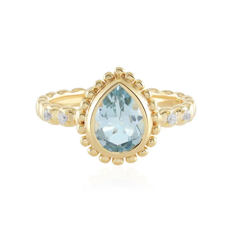 Unser Ring mit himmelblauem Topas ist ein Meisterwerk von subtiler Eleganz für Ihre Schmucksammlung. Dieser Ring aus vergoldetem 925er Sterlingsilber präsentiert einen Topas im Tropfenschliff von 1,608 Karat aus Madagaskar, der einen ruhigen himmelblauen Farbton aufweist. Flankiert von funkelnden Zirkonen aus Kambodscha mit einem Gesamtgewicht von 0,084 Karat, ist der Ring ein Inbegriff von Anmut. Kombinieren Sie ihn mit Ihrem Lieblingscocktailkleid für eine Abendveranstaltung oder verleihen Sie Ihrem Alltagsoutfit einen Hauch von Luxus. Dieses Schmuckstück ist nicht nur ein Zeichen von Raffinesse, sondern auch eine Feier der Schönheit der Welt, direkt an Ihrem Finger.