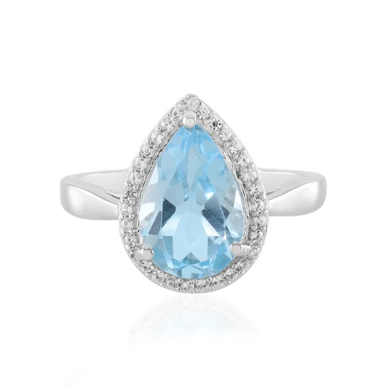 Entdecken Sie die unverfälschte Eleganz dieses Rings mit einem Gesamtgewicht von 3,287 Karat und einem bezaubernden himmelblauen Topas aus Brasilien, der meisterhaft in Tropfenform geschliffen wurde, um seinen strahlenden Farbton zu betonen. Umgeben von einem Halo aus funkelnden Zirkonen aus Kambodscha, verspricht dieser Ring aus 925er Sterlingsilber mit Platinbeschichtung eine luxuriöse Ergänzung Ihrer Kollektion. Ideal für elegante Abende oder als raffiniertes Accessoire für den Tag ist dieser Ring ein Fest des Stils und der Anmut.