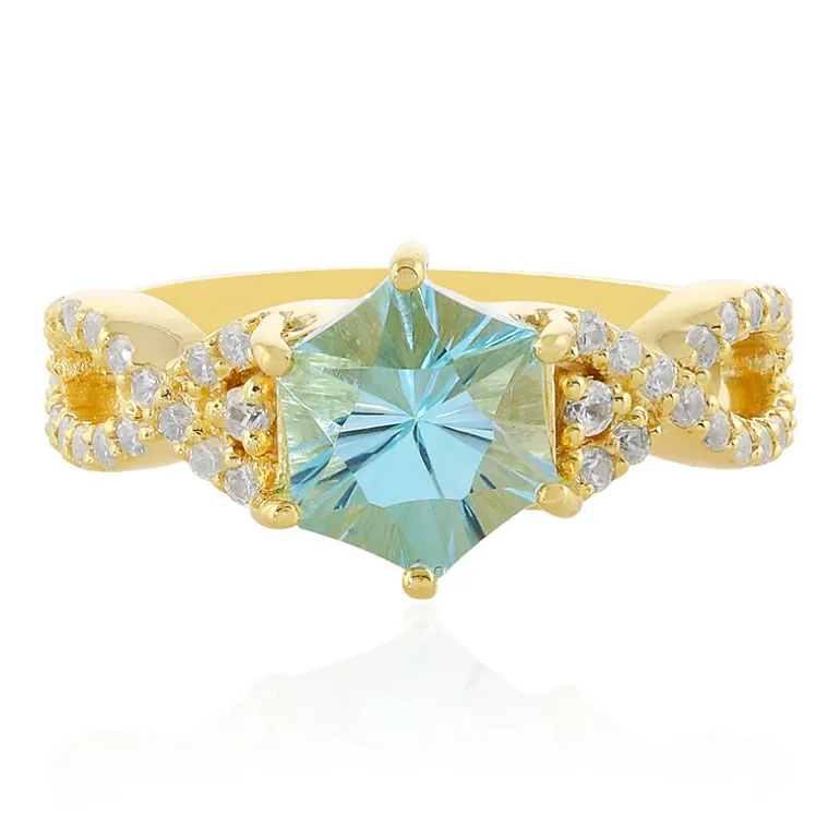 Entdecken Sie den verführerischen Charme unseres Rings mit himmelblauem Topas aus Madagaskar, der mit seinem sechseckigen Sternschliff das Licht brillant einfängt. Der zentrale Edelstein von 1,94 Karat wird von funkelnden Zirkonen aus Kambodscha umrahmt, die insgesamt 0,502 Karat ausmachen. Der Ring aus 925er Sterlingsilber mit opulenter Vergoldung wiegt 3,53 g und ist ein echter Hingucker. Mit einer Größe von 27×22 mm ist er ein substanzielles und doch raffiniertes Stück. Sein ruhiger blauer Farbton und sein glitzerndes Gefolge versprechen, dass er bei jeder gesellschaftlichen Verabredung die Blicke auf sich zieht – perfekt, um Tageskleidung aufzuwerten oder einen eleganten Abendlook zu ergänzen.