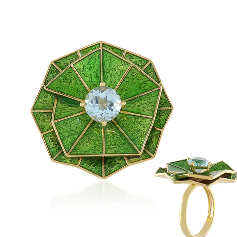 Dieser bezaubernde Ring ist mit einem 1,485 Karat schweren himmelblauen Topas aus Brasilien besetzt, der exquisit rund geschliffen ist. Er ist in wunderschön vergoldetes 925er Sterlingsilber gefasst und besticht durch sein einzigartiges Design, das an eine zarte Blüte erinnert. Dieser Ring ist perfekt, um Ihrem Outfit einen Farbtupfer zu verleihen, und passt sowohl zu legeren als auch zu formellen Anlässen. Ideal für besondere Anlässe oder einen raffinierten Alltagslook.