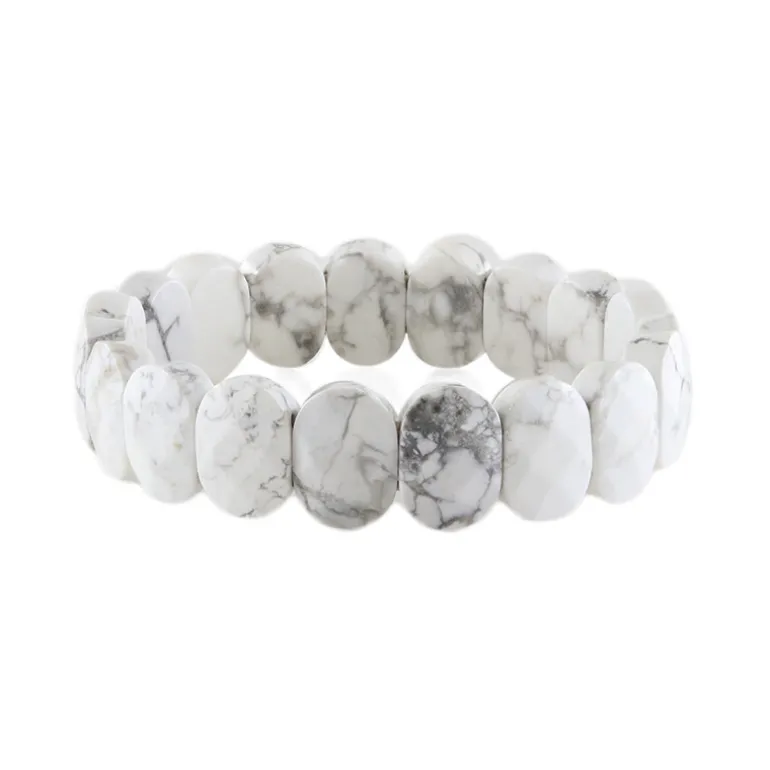 Entdecken Sie die zeitlose Schönheit des Chic Howlite Armbands mit 131,46 Karat facettierten ovalen Perlen aus den USA. Jede einzelne Perle zeigt die markanten marmorierten Muster, die einzigartig für Howlite sind. Dieses Armband eignet sich sowohl für legere als auch für formelle Anlässe und passt sowohl zu einfarbigen Outfits als auch zu farbenfrohen Stücken. Ideal für alle, die Eleganz mit einem natürlichen Touch suchen.