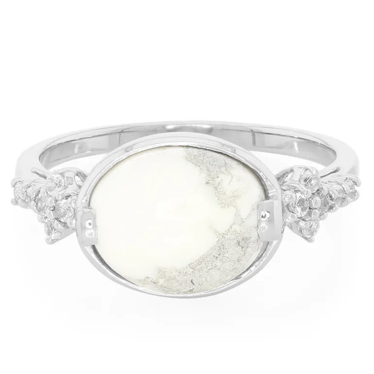 Dieser schicke ovale Cabochon-Ring enthält einen atemberaubenden kanadischen Howlite von 3,5 Karat, der für seine ruhigen weißen Farbtöne und marmorierten grauen Muster bekannt ist. Eingefasst in hochwertiges 925er Sterling Silber und flankiert von funkelnden brasilianischen weißen Topasen von insgesamt 0,168ct, strahlt dieses Stück Raffinesse aus. Mit einer Größe von 31×24,5 mm ist er das perfekte Accessoire für Tages- und Abendoutfits und verleiht sowohl der Freizeit- als auch der Gesellschaftskleidung einen Hauch von Eleganz.