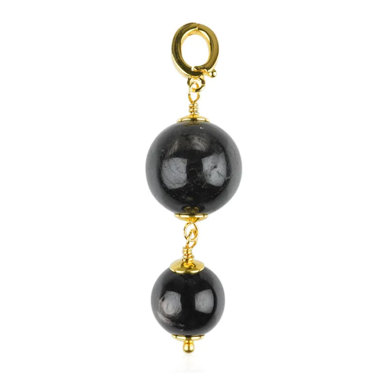 Dieser exquisite Anhänger besticht durch ein Duo aus kanadischen Hypersthen-Perlen mit einem Gesamtgewicht von bemerkenswerten 37,5 Karat. Die größere 26-karätige Perle funkelt neben ihrem 11,5-karätigen Gegenstück, die beide sorgfältig abgerundet sind und 14 mm bzw. 11 mm messen. Der Anhänger ist in einer zarten Fassung aus 925er Sterlingsilber mit einer üppigen Goldauflage von ca. 1,1 g gefasst und ein echtes Schmuckstück. Der innovative Varioclip verleiht diesem raffinierten Accessoire Vielseitigkeit und ermöglicht es, es mit Leichtigkeit an verschiedenen Ketten zu tragen. Perfekt, um Ihre Abendgarderobe aufzuwerten oder Ihren Alltagsoutfits einen Hauch von Eleganz zu verleihen.
