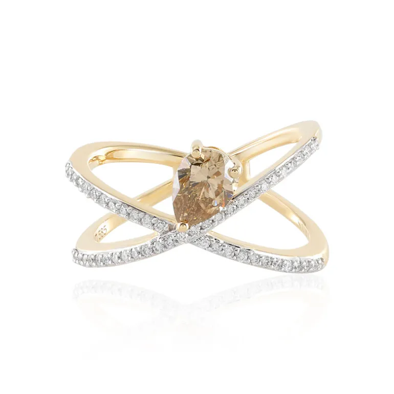 Dieser Crossover-Ring setzt mit seinem eleganten Design ein Zeichen der Raffinesse. Ein zentraler champagnerfarbener Diamant von 0,675 ct fängt mit seinem Birnenbrillantschliff das Licht ein und wird von 51 funkelnden Diamanten der Reinheit SI2, die in 14 Karat Gelbgold gefasst sind, harmonisch umrahmt. Mit einem Edelsteingewicht von insgesamt 0,882 ct. ist seine schimmernde Wärme eine schicke Ergänzung für jedes Outfit. Ideal für Cocktailevents oder einfach als eleganter Begleiter im Alltag.