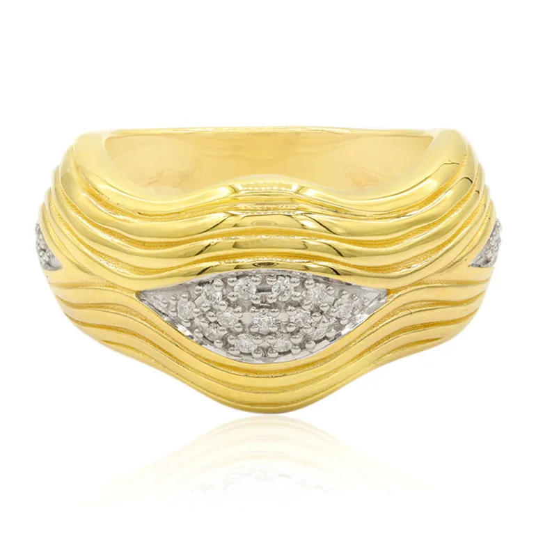 Entdecken Sie Eleganz mit einem modernen Twist in diesem vergoldeten 925 Sterling Silber Ring. Er präsentiert 15 Diamanten im Brillantschliff I1 (G) mit einem Gesamtgewicht von 0,08 ct, eingebettet in ein einzigartiges Wellendesign, das das Licht wunderschön einfängt. Mit seinen Maßen von 21 x 21 mm setzt dieser Ring ein Zeichen, ohne dabei sein raffiniertes Aussehen zu verlieren. Die geschichteten Wellen in glänzender Goldplattierung verleihen ihm Tiefe und machen ihn sowohl für zwanglose Ausflüge als auch für gehobene Anlässe geeignet. Kombinieren Sie ihn mit Ihren goldenen Lieblingsaccessoires für einen stimmigen, stilvollen Look.