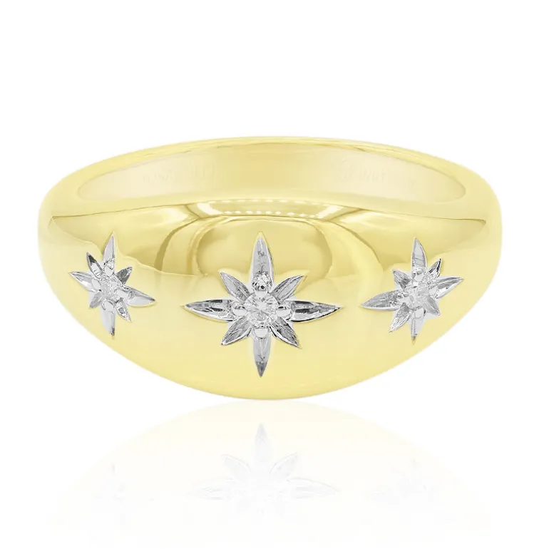 Dieser schillernde Ring besteht aus einem Trio von Diamanten der Reinheit I1 mit einem Gesamtgewicht von 0,034 Karat, die fachmännisch in glänzendes vergoldetes 925er Sterlingsilber gefasst sind. Das moderne Design bringt die funkelnde Brillanz der Edelsteine im Rundschliff zur Geltung, die jeweils etwa 1,5 mm und 1,3 mm groß sind. Mit einer Ringfläche von 20 x 19 mm ist er ein elegantes Accessoire für jedes Outfit, das Ihrer Abendgarderobe einen Hauch von Raffinesse verleiht oder Ihre Alltagskleidung aufwertet.