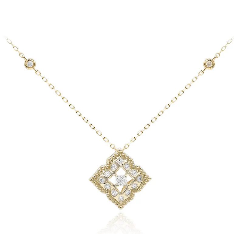 Dieses exquisite Collier mit einem Gesamtkaratgewicht von 0,194 ct besteht aus einem atemberaubenden runden Brillanten in der Mitte und 14 kleineren Diamanten, die in 14 Karat Gelbgold gefasst sind. Das elegante Design und die zarte Kette, die von 40,5 bis 45,5 cm verstellbar ist, eignen sich sowohl für den Alltag als auch für besondere Anlässe. Kombinieren Sie ihn mit einem schicken Kleid oder einem legeren Ensemble, um ihm einen Hauch von Raffinesse zu verleihen.