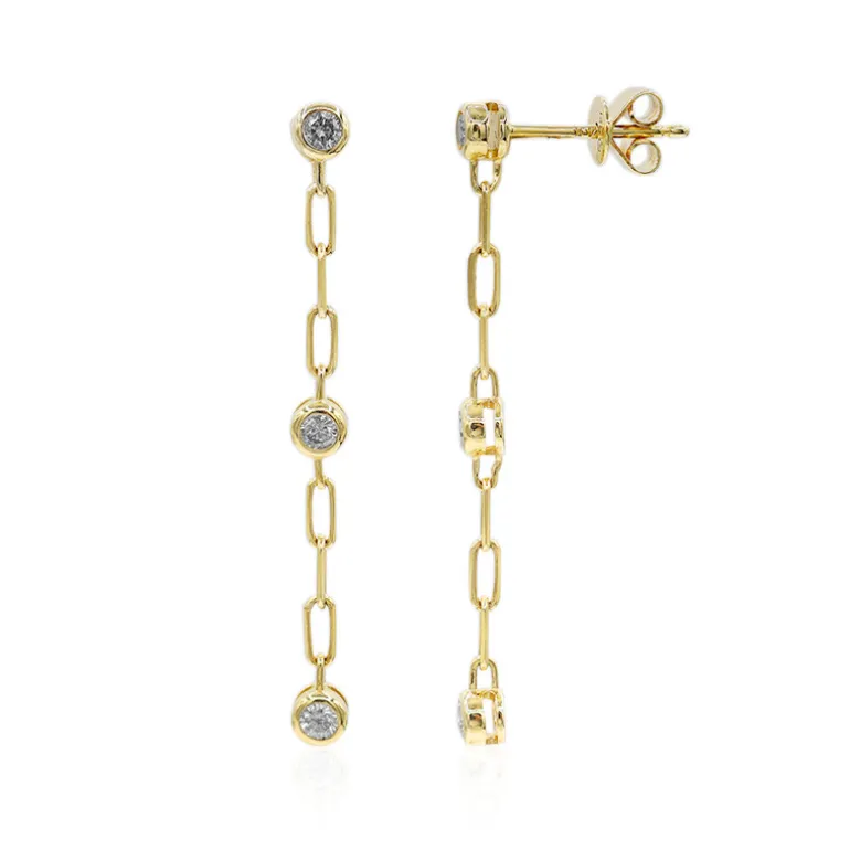 Diese exquisiten Diamant-Ohrringe aus Gold haben ein modernes Kettendesign, das sechs runde Diamanten im Brillantschliff mit insgesamt 0,242 Karat perfekt in Szene setzt. Die eleganten Ohrringe aus 585er Gelbgold mit einer Länge von 37 mm werten jedes Outfit auf und eignen sich daher sowohl für den Alltag als auch für besondere Anlässe. Kombinieren Sie sie mit einem Abendkleid oder einem eleganten Business-Anzug für einen raffinierten Look.
