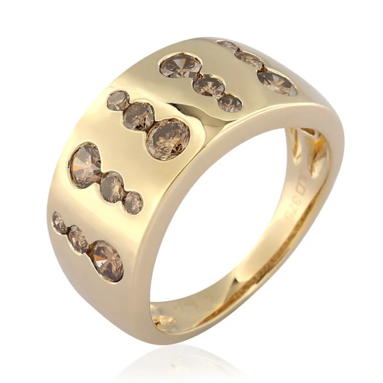 Entdecken Sie den schillernden Glanz unseres Rings aus 9 Karat Gold, der eine Reihe von champagnerfarbenen Diamanten mit einem Gesamtgewicht von 1,148 Karat präsentiert. Jeder Diamant wurde meisterhaft geschliffen, um das Funkeln zu maximieren, und sorgfältig gefasst, um einen eleganten Wandteppich aus Licht und Farbe zu bilden. Die beträchtlichen 4,84 g schimmernden Goldes bilden ein luxuriöses Band für dieses opulente Ensemble. Dieser Ring ist perfekt für alle, die unaufdringliche Eleganz zu schätzen wissen und verspricht, sowohl tagsüber schick als auch abends glamourös zu sein.