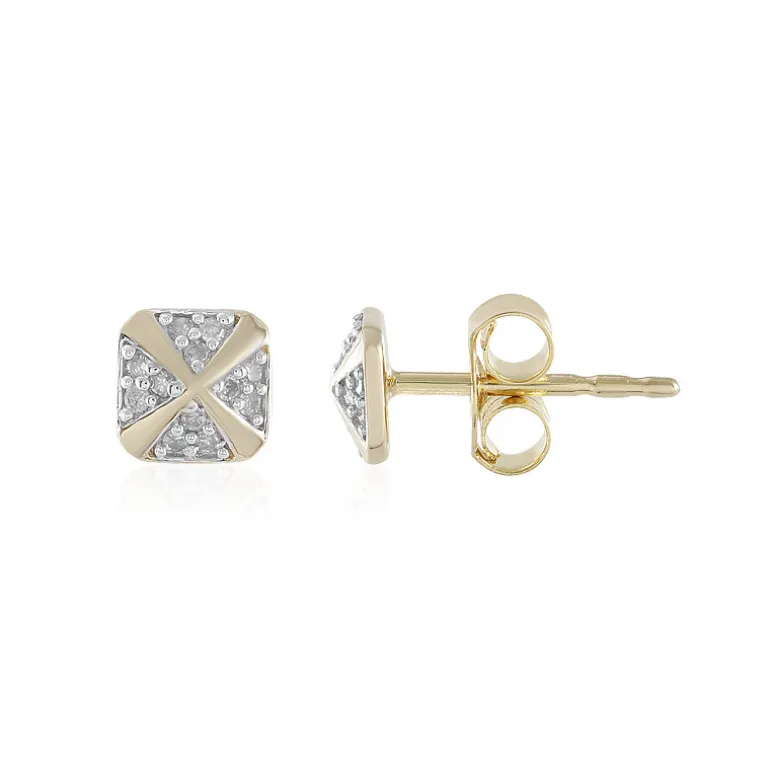 Diese schicken quadratischen Ohrstecker sind eine moderne Ergänzung für jede Schmucksammlung. Gefertigt aus 925er Sterlingsilber mit einer eleganten Goldplattierung, ist jeder Ohrring mit 24 funkelnden Diamanten im Rundschliff I2 (I) von insgesamt 0,108 Karat besetzt. Das geometrische Kreuzdesign verleiht ihm einen modernen Touch. Sie eignen sich sowohl für die Freizeit als auch für formelle Anlässe, schimmern auf einer Dinnerparty oder verschönern ein Arbeitsoutfit.