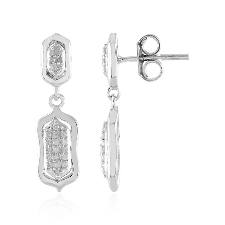 Diese bezaubernden Ohrringe aus Sterlingsilber versprühen eine Art-Deco-Ausstrahlung mit modernem Touch. Jeder Ohrring ist mit einer Reihe funkelnder Diamanten im Rundschliff von insgesamt 0,216 Karat besetzt, die sorgfältig in eine geometrische Silhouette gefasst sind, die Raffinesse ausstrahlt. Mit einem Gewicht von ca. 2,7 Gramm bietet die zarte, aber robuste Konstruktion sowohl Komfort als auch Haltbarkeit. Sie sind ein passendes Accessoire für formelle Anlässe ebenso wie für zwanglose Ausflüge. Sie passen hervorragend zu einem kleinen schwarzen Kleid oder verleihen einer schlichten Bluse und Jeans einen Hauch von Glamour.