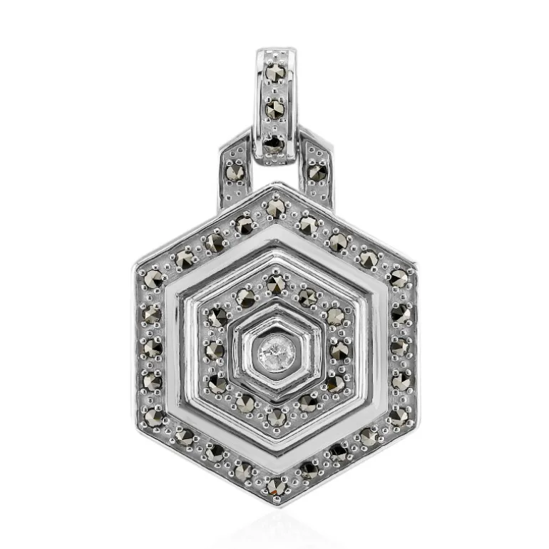 Inspiriert von der geometrischen Eleganz des Art Déco, präsentiert dieser Anhänger aus Sterlingsilber auf elegante Weise einen Diamanten im Brillantschliff (0,06 Karat), der von 41 glitzernden österreichischen Markasiten (insgesamt 0,41 Karat) umgeben ist. Der aus 925er Sterlingsilber gefertigte Anhänger mit einem Gewicht von ca. 5,9 g verbindet Vintage-Charme mit moderner Raffinesse und ist perfekt geeignet, um jedem Outfit einen Hauch von Klasse zu verleihen. Ideal für formelle Anlässe oder für den Alltag, ist es eine vielseitige Ergänzung für jede Schmucksammlung.