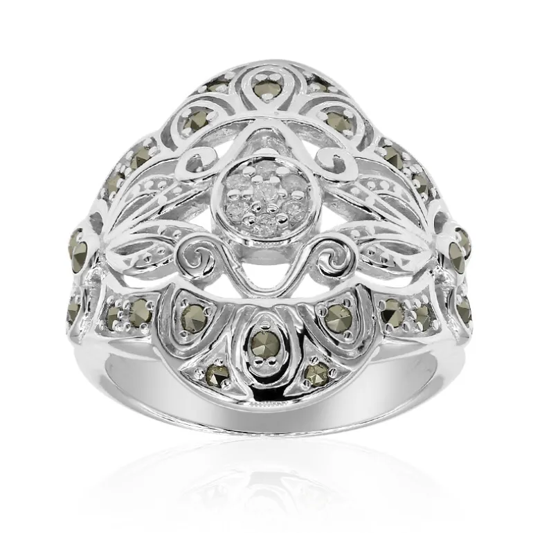 Entdecken Sie den Charme dieses Rings aus Sterlingsilber im Vintage-Stil, der mit einem raffinierten Spiel von Diamanten im Brillantschliff und leuchtenden Markasiten verziert ist. Dieses anmutige und raffinierte Schmuckstück enthält 0,4 Karat Edelsteine, die aus den berühmten Minen Rumäniens stammen. Sein klassisches Design passt sowohl zu formellen als auch zu legeren Anlässen und macht ihn zur idealen Wahl für den eleganten Alltag oder besondere Anlässe. Die raffinierte Silberverarbeitung des Rings, der etwa 5,2 Gramm wiegt, garantiert sowohl Haltbarkeit als auch zeitlosen Stil.