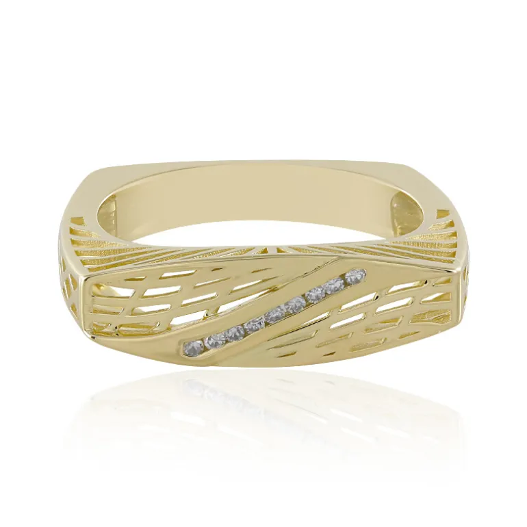 Dieser Ring aus 9-karätigem Gelbgold aus der Ornaments-Kollektion von de Melo zeichnet sich durch ein kompliziertes Gittermuster aus, das eine Reihe von neun Diamanten der Reinheit I2 mit insgesamt 0,049 Karat umschließt. Die harmonische Mischung aus goldener Wärme und dem Funkeln der Diamanten schafft ein Stück, das sowohl modern als auch zeitlos ist. Mit einem Gesamtgewicht von ca. 2,8 Gramm Gold ist er perfekt für das tägliche Tragen oder besondere Anlässe. Lassen Sie diesen Ring zu einer raffinierten Ergänzung Ihres Ensembles werden.