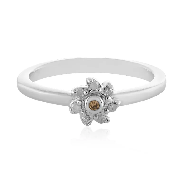 Entdecken Sie den zarten Charme unseres von Blumen inspirierten Rings mit einem funkelnden champagnerfarbenen Diamanten von 0,012 Karat in seinem Herzen, umgeben von sechs Diamanten im Brillantschliff mit insgesamt 0,051 Karat. Der aus hochwertigem 925er Sterlingsilber mit präziser Handwerkskunst gefertigte Ring hat ein Gesamtgewicht von 0,063 ct, eingebettet in ein charmantes Blumendesign. Das Band aus Sterlingsilber passt zu jedem Outfit und eignet sich perfekt für den eleganten Alltag oder besondere Anlässe. Kombinieren Sie dieses vielseitige Schmuckstück mit Ihrem Lieblingskleid oder einem legeren Ensemble, um ihm einen Hauch von Raffinesse zu verleihen.