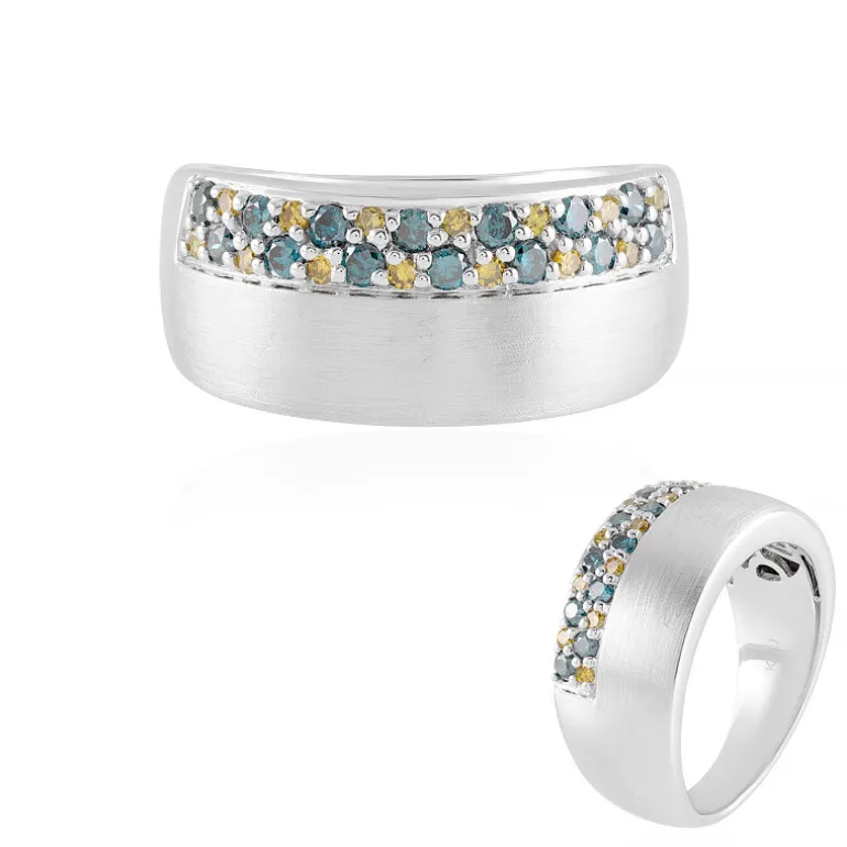 Dieser Ring aus 9-karätigem Gold, die neueste Kreation von KM by Juwelo, ist ein Fest der Farben und der Raffinesse. Eingebettet in das Edelmetall sind 28 Brillanten I3 mit insgesamt 0,441 Karat, die eine atemberaubende Kombination aus blauen und gelben Farbtönen präsentieren. Die Oberfläche aus gebürstetem Gold verleiht ihm einen modernen Touch und macht ihn zu einem idealen Accessoire für moderne Ensembles und besondere Anlässe. Er ist eine exquisite Wahl für alle, die ihrer Schmucksammlung einen Hauch von Eleganz und Luxus verleihen möchten.