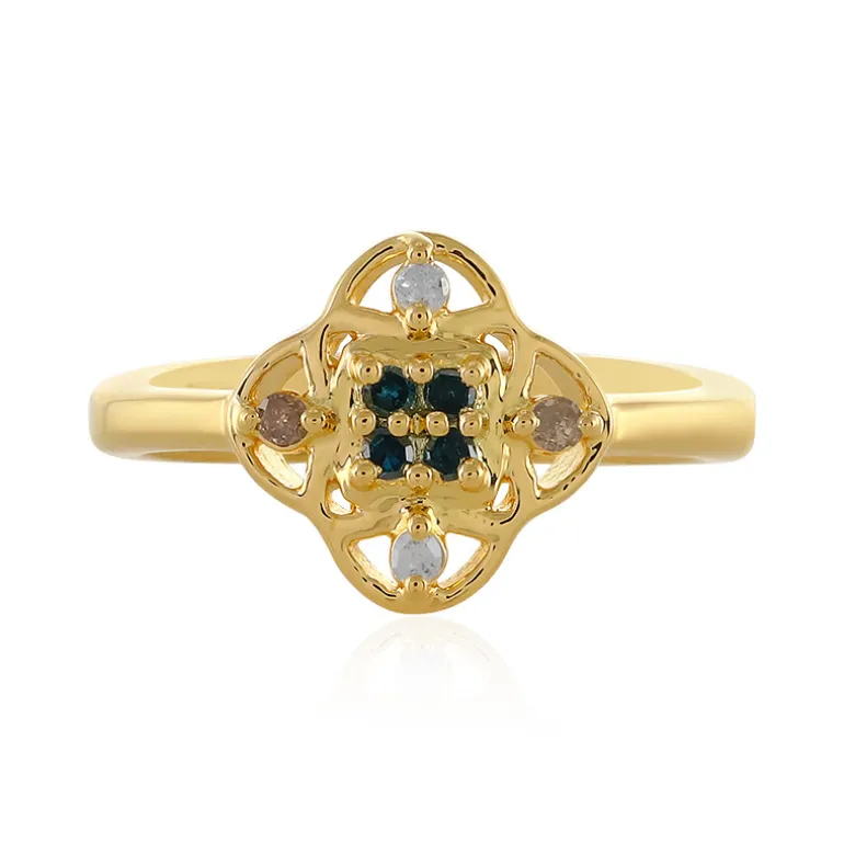 Dieser Ring aus vergoldetem 925er Sterling Silber besticht durch seine 0,123 Karat an vielfarbigen Diamanten. Jeder Edelstein ist perfekt geschliffen, so dass die blauen, champagnerfarbenen und klaren Töne im Einklang schimmern. Das filigrane Design vermittelt Vintage-Charme mit modernem Feingefühl und macht ihn zu einem vielseitigen Schmuckstück, das sich sowohl für den eleganten Alltag als auch für besondere Anlässe eignet. Kombinieren Sie es mit Pastell- oder Erdtönen für einen harmonischen Look.