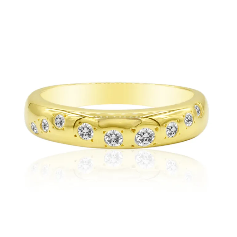 Entdecken Sie die zeitlose Eleganz dieses Rings aus 18 Karat Gold, der mit einer Auswahl an lupenreinen Diamanten von insgesamt 0,195 Karat besetzt ist. Jeder Brillant ist sorgfältig gefasst, um sein Strahlen zu maximieren, ergänzt durch den warmen Glanz des polierten Goldbandes, das etwa 3,52 Gramm wiegt. Dieses raffinierte Schmuckstück eignet sich perfekt für besondere Anlässe oder als exquisites Geschenk und verspricht, Sie zu verzaubern. Kombinieren Sie es mit Ihrer Lieblingsabendgarderobe für einen tadellosen Hauch von Luxus.