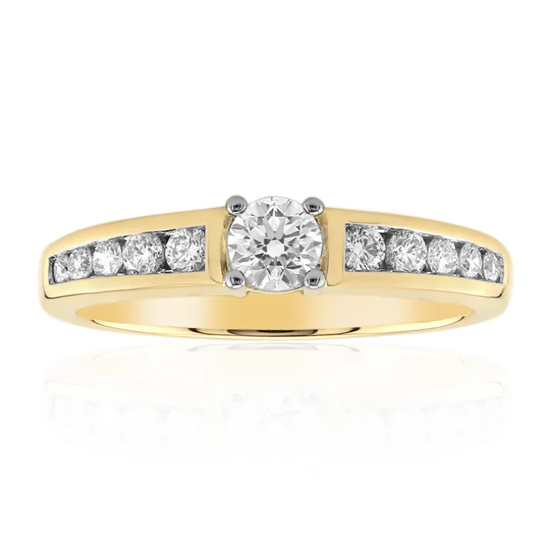 Dieser zeitlose Ring aus 14-karätigem Gelbgold besticht durch seine exquisiten Diamanten im lupenreinen Innenschliff (IF) von insgesamt 0,485 Karat. Das Herzstück ist ein runder Brillant von 0,25 Karat, der von kunstvoll angeordneten kleineren Diamanten flankiert wird, die sein Funkeln noch verstärken. Dieser Ring ist ideal für Verlobungen oder besondere Anlässe. Er passt hervorragend zu eleganter Kleidung und verspricht einen Hauch von Raffinesse und Glamour.