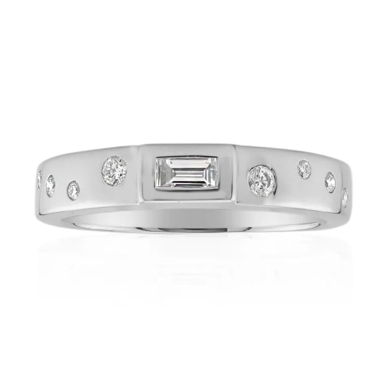Dieser sorgfältig gearbeitete Ring zeichnet sich durch eine harmonische Mischung aus Baguette- und Brillant-Diamanten im Rundschliff von insgesamt 0,208 Karat aus, die in warmes 14-karätiges Gold gefasst sind. Der zentrale Baguettediamant wird von kleineren, funkelnden Begleitern flankiert und strahlt eine zeitlose Anmut aus, die sich sowohl für den Alltag als auch für besondere Anlässe eignet. Mit einem Gewicht von etwa 3 Gramm ist das Goldband sehr massiv und dennoch angenehm zu tragen. Dieser Ring könnte ein Geschäftsoutfit ergänzen oder einem Abendkleid einen Hauch von Glamour verleihen.