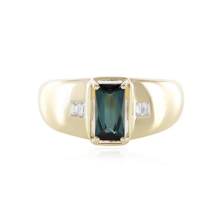 Entdecken Sie den opulenten Charme unseres brasilianischen Indigolith-Rings, gekrönt von einem 0,727 Karat schweren, achteckigen Edelstein im Radiant-Schliff, eingefasst in glänzendes 375er Gelbgold. Dieses elegante Schmuckstück hat ein Gesamtgewicht von 0,83 Karat und ist mit vier funkelnden kambodschanischen Zirkon-Baguetten besetzt. Das schlichte, moderne Design, das durch den tiefblauen Farbton akzentuiert wird, macht ihn zu einer vielseitigen Ergänzung sowohl für legere als auch für formelle Anlässe. Als Zeugnis exquisiter Handwerkskunst ist er ein zeitloses Accessoire für Menschen mit einer Vorliebe für raffinierten Stil.