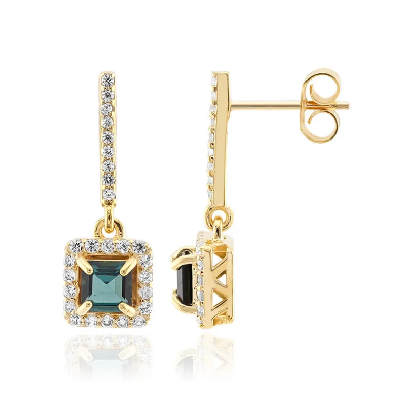 Schmücken Sie sich mit diesen exquisiten Indigolith-Ohrringen. Die strahlenden Edelsteine aus Brasilien sind in vergoldetes 925er Sterlingsilber gefasst. Ihre Eleganz wird durch 54 kambodschanische Zirkone unterstrichen, die sie unbestreitbar machen. Diese Ohrringe eignen sich sowohl für den Tag als auch für die Nacht und verleihen jedem Outfit einen Hauch von Raffinesse. Kombinieren Sie sie mit einem schicken Kleid oder einem eleganten Abendkleid für einen wirklich auffälligen Look.