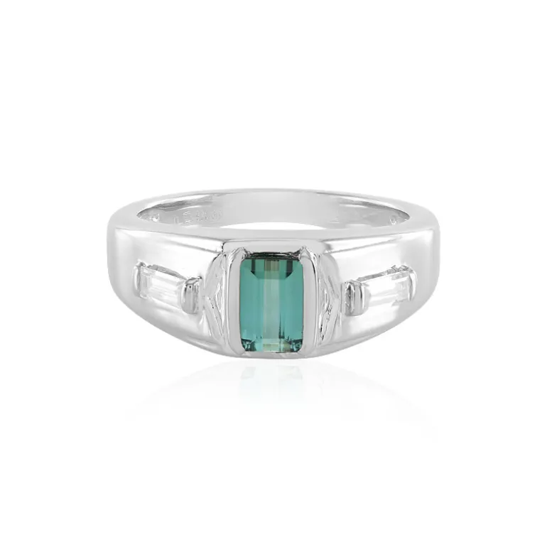 Entdecken Sie die kühle Eleganz dieses brasilianischen Indigolith-Rings mit einem zentralen Stein im einzigartigen Achteck-Stufenschliff, flankiert von zwei kambodschanischen Zirkonen im polierten Baguetteschliff. Beide Steine zusammen erzeugen ein faszinierendes Lichtspiel. Der aus hochwertigem 925er Sterlingsilber gegossene und mit einer luxuriösen Platinbeschichtung versehene Ring hat ein Edelsteingewicht von insgesamt 0,796 ct. Dieser Ring ist perfekt geeignet, um sowohl am Tag als auch am Abend einen Hauch von Raffinesse zu zeigen und verspricht, eine wertvolle Ergänzung für jede Schmucksammlung zu werden.
