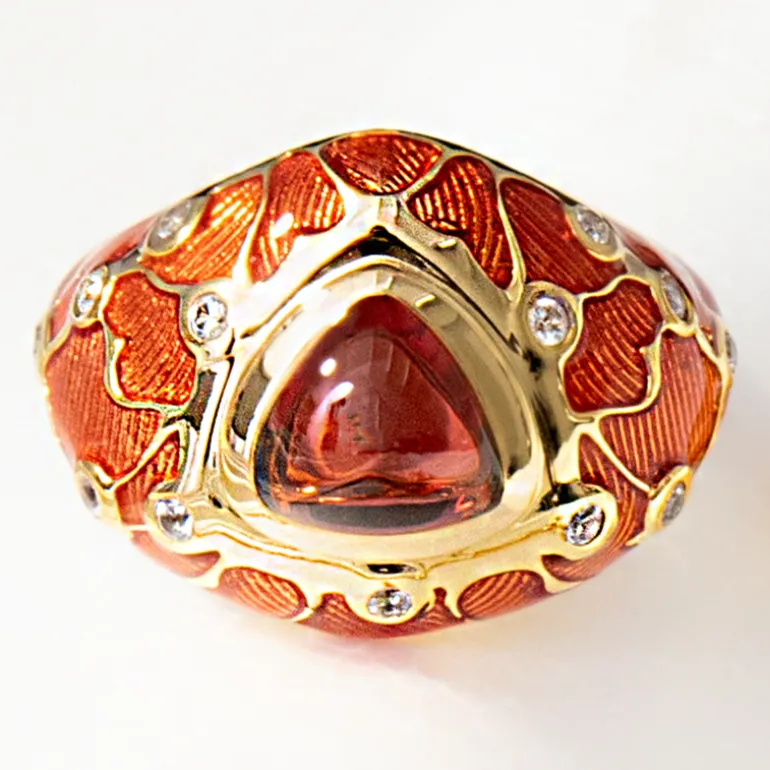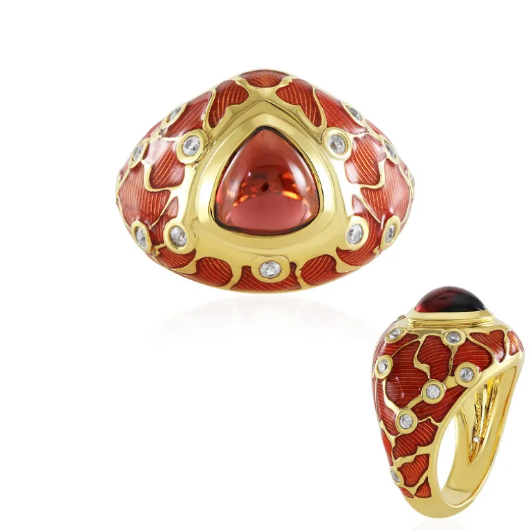 Dieser Ring aus vergoldetem Sterlingsilber umhüllt Ihren Finger mit einem fesselnden indischen Granat-Cabochon im Trillant-Schliff von 2,925 Karat. Flankiert von funkelnden Zirkonen mit einem Gesamtgewicht von 0,243 Karat, besticht der Ring durch sein komplexes Design. Seine beeindruckende Präsenz wird durch eine glänzende Oberfläche unterstrichen, die ihn perfekt für formelle Anlässe oder als luxuriöses Alltags-Accessoire macht. Kombinieren Sie dieses Statement-Stück mit Erdtönen oder tiefen Rottönen für ein Ensemble, das alle Blicke auf sich zieht.