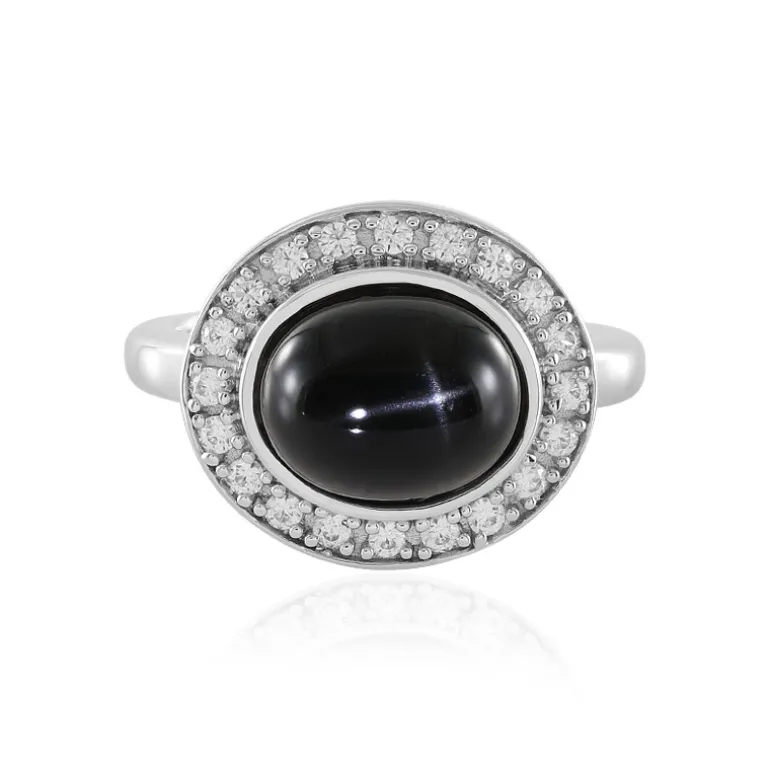 Dieser atemberaubende Ring präsentiert einen fesselnden 3,565-karätigen indischen Sterndiopsid, der fachmännisch zu einem ovalen Cabochon verarbeitet wurde. Umgeben von 20 schimmernden kambodschanischen Zirkonen beträgt das Gesamtkaratgewicht 3,964 ct. Eingefasst in 925er Sterlingsilber mit einer luxuriösen Plattierung, strahlt dieses Stück Eleganz aus. Perfekt für Abendveranstaltungen, kombiniert mit einem eleganten schwarzen Kleid für einen wirklich raffinierten Look.