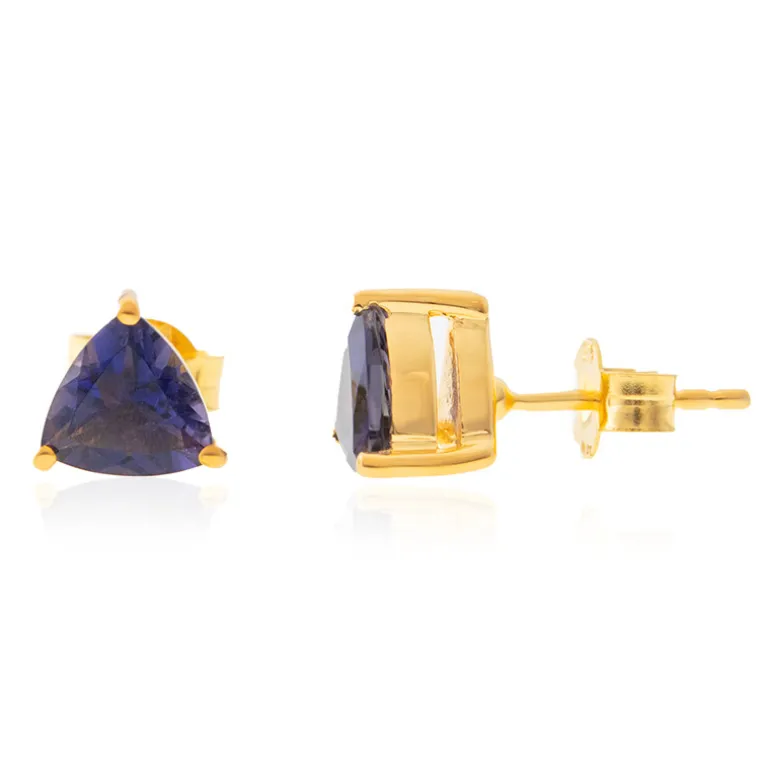 Entdecken Sie die fesselnde Anziehungskraft dieser indischen Iolith-Ohrstecker im Trillant-Schliff. Jeder Edelstein wurde sorgfältig bearbeitet, um seine tiefblauen Farbtöne zur Geltung zu bringen, und ist kunstvoll in 925er Sterlingsilber mit einer luxuriösen Goldplattierung gefasst. Mit einem Gewicht von ca. 1,67 Karat und einem Gesamtmetallgewicht von ca. 2,06 Gramm sind sie ein Zeugnis der Eleganz. Diese Ohrringe eignen sich perfekt, um Ihrer Geschäftskleidung einen Hauch von Raffinesse zu verleihen oder ein Abendensemble aufzuwerten, und sind vielseitig einsetzbar.