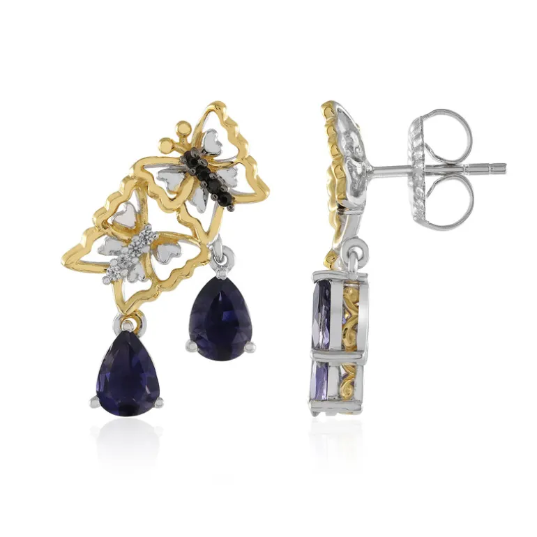 Entdecken Sie die Eleganz dieser exquisiten Iolith-Sterlingsilber-Schmetterlings-Ohrringe. Mit 4 birnenförmigen Iolithen aus Indien, 8 Zirkonen aus Kambodscha und 8 schwarzen Spinellen aus Brasilien sind diese Ohrringe eine Symphonie aus Farbe und Glanz. Perfekt, um der Abendgarderobe einen Hauch von Raffinesse zu verleihen oder ein charmantes Tagesoutfit aufzuwerten. Das einzigartige Schmetterlingsdesign sorgt für zeitlosen Stil und Anmut.