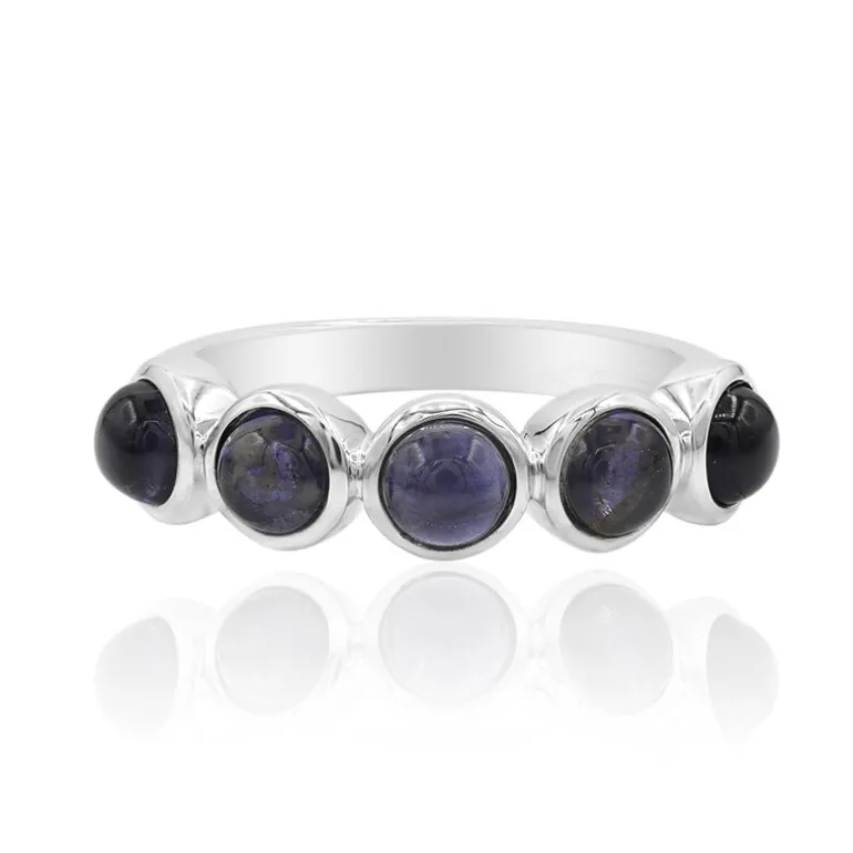Dieser bezaubernde Ring aus Sterlingsilber glänzt mit den tiefblauen Farbtönen von fünf runden indischen Iolithen im Cabochon-Schliff, die insgesamt 1,15 Karat ausmachen. Das aus 925er Sterlingsilber gefertigte Design verfügt über ein schlankes Band mit etwa 2,2 Gramm Silber, das sich um Ihren Finger wickelt. Sein modernes und doch zeitloses Design macht ihn vielseitig einsetzbar, ob im Alltag oder zu besonderen Anlässen. Kombinieren Sie ihn mit einer frischen weißen Bluse, um die Farben hervorzuheben, oder mit einem Abendkleid für zusätzliche Eleganz.