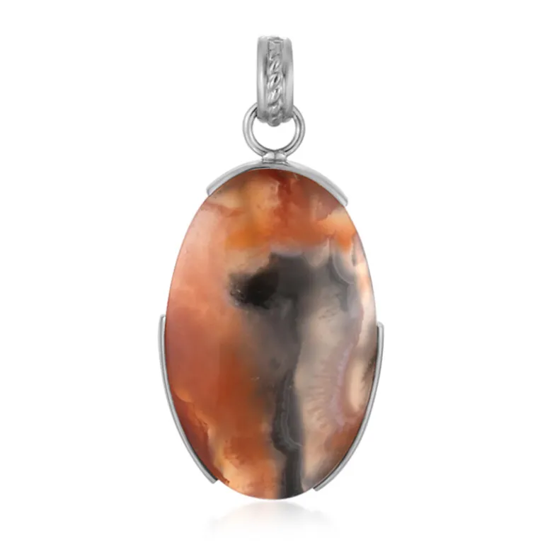 Inspiriert vom mystischen balinesischen Barong, zeigt dieser Anhänger einen faszinierenden ovalen 30-karätigen Cabochon aus Karneol, der aus den vulkanischen Böden von Java stammt. Die erdigen Orangetöne des Edelsteins sind in poliertes 925er Sterlingsilber mit einer Platinveredelung für zusätzlichen Glanz eingefasst. Der 32×20 mm große Stein strahlt einen Hauch von Mystik und Tradition aus und wird von einem 42×21 mm großen Anhänger getragen. Dieser Anhänger ist ein bezauberndes Accessoire, das sowohl zur Freizeit- als auch zur Abendgarderobe passt. Er ist ein Gesprächsanlass und eine Hommage an das indonesische Erbe.