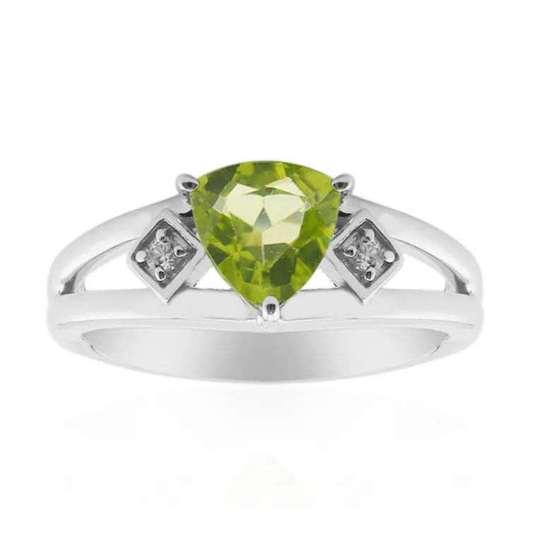 Dieser atemberaubende Ring präsentiert einen bezaubernden Jilin-Peridot im Trillant-Schliff (0,655 Karat), der elegant in 925er Sterlingsilber gefasst ist. Der leuchtend grüne Peridot wird perfekt von zwei tansanischen Zirkonen akzentuiert, die eine harmonische Mischung aus Farbe und Funkeln schaffen. Mit einem Gesamtkaratgewicht von 0,692 ct verkörpert dieses Schmuckstück die Essenz von anspruchsvollem Glamour. Dieser Ring ist ideal für die Eleganz des Alltags oder als geschmackvolles Accessoire für besondere Anlässe – er ist die Vielseitigkeit in Person.