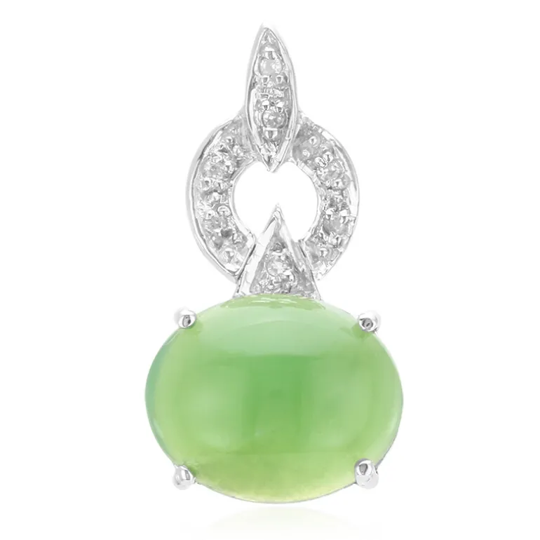 Entdecken Sie die Faszination dieses Imperial Chrysopras Sterlingsilber-Anhängers mit einem ovalen Cabochon von 1,83 Karat aus Australien. Dieses elegante Schmuckstück aus schimmerndem 925er Sterlingsilber wird von sieben kambodschanischen Zirkonsteinen akzentuiert und strahlt einen ruhigen grünen Farbton aus. Er eignet sich sowohl für den Alltag als auch für besondere Anlässe. Kombinieren Sie ihn mit einer eleganten Bluse oder einem formellen Kleid, um jedes Outfit aufzuwerten.