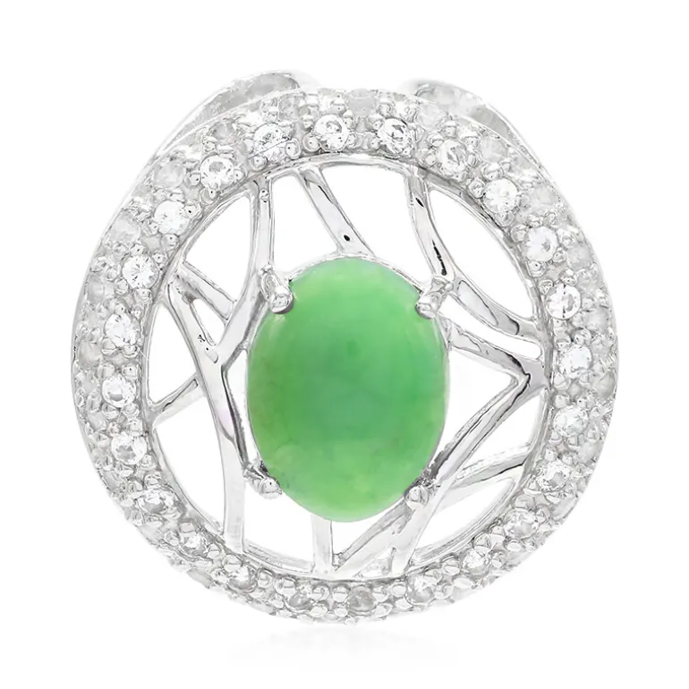 Lassen Sie sich von der kaiserlichen Eleganz dieses ovalen Chrysopras-Anhängers in 925er Sterlingsilber verzaubern. Der zentrale Edelstein, der aus den fruchtbaren Böden Australiens stammt, besticht durch seinen grünen Farbton und seinen glatten Cabochon-Schliff, der einen schönen Kontrast zu dem funkelnden Halo aus 48 runden weißen Topasen im Brillantschliff aus Brasilien bildet. Mit einem Gesamtgewicht von 1,549 Karat strahlt dieser Anhänger Raffinesse aus und eignet sich ideal zur Ergänzung Ihrer Abendgarderobe oder zur Aufwertung eines lässigen Tageslooks.