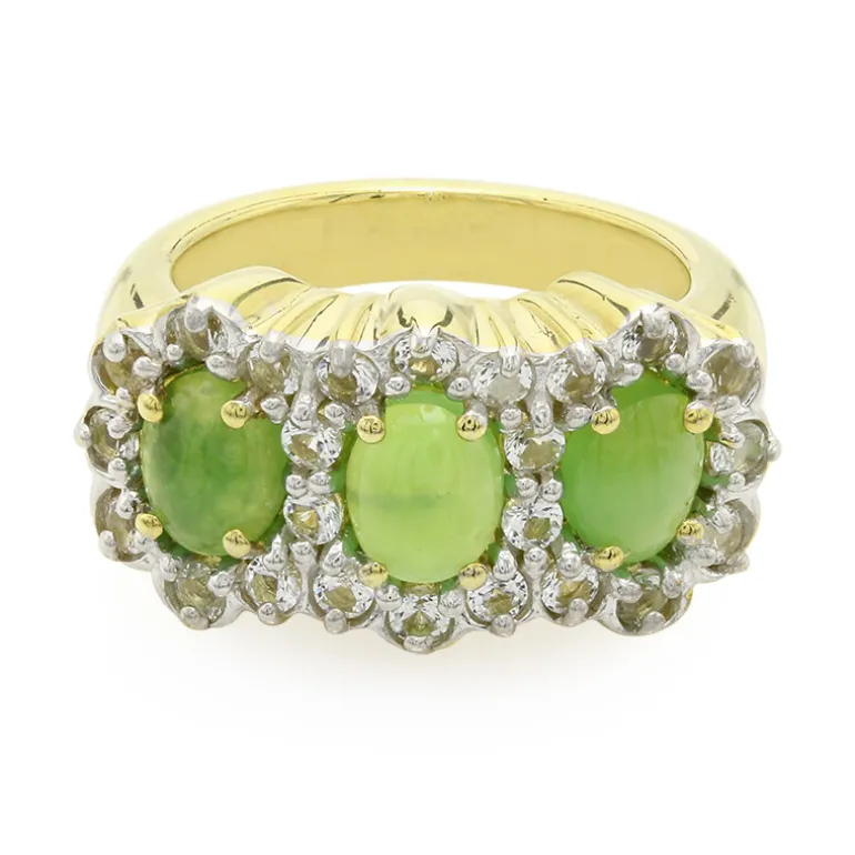 Entdecken Sie die Eleganz dieses atemberaubenden Rings mit drei australischen Chrysopras-Edelsteinen in bezauberndem Grün, die von 24 funkelnden weißen Topasen aus Brasilien ergänzt werden. Aus vergoldetem 925er Sterlingsilber gefertigt, strahlt dieses Schmuckstück Luxus und Stil aus. Perfekt für besondere Anlässe oder als glamouröses Accessoire für den Alltag – ein Muss für alle Schmuckliebhaber.