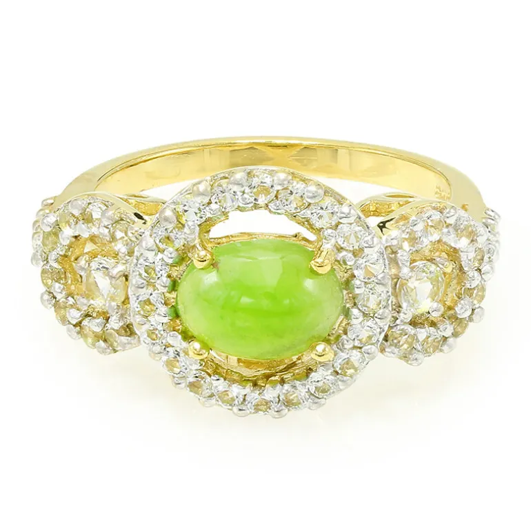 Erleben Sie den lebendigen Charme Australiens mit unserem vergoldeten Ring aus Sterlingsilber mit einem ovalen Chrysopras in der Mitte, umgeben von strahlend weißen Topasen. Mit einem Gesamtgewicht von 1,704 Karat vereint dieser Ring üppiges Grün mit funkelndem Glanz und macht ihn zu einer herausragenden Ergänzung für jedes Ensemble. Dieser Ring eignet sich sowohl für zwanglose Brunchs als auch für formelle Abende und verspricht, Ihrer Schmucksammlung einen Hauch von Farbe und Raffinesse zu verleihen.