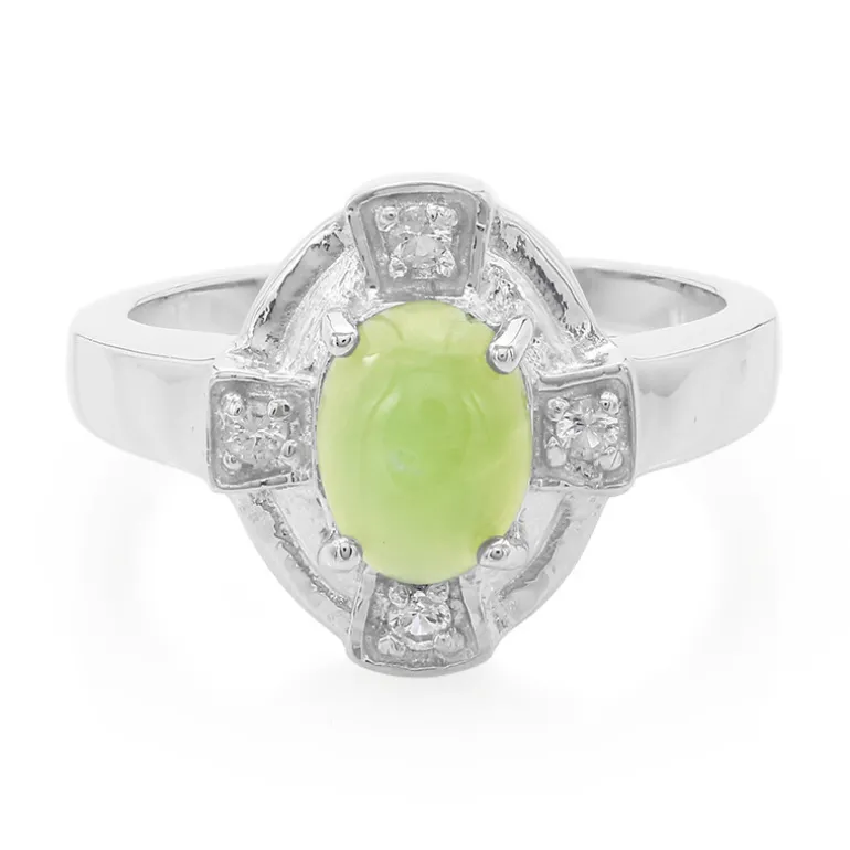 Dieser Ring präsentiert einen exquisiten australischen Chrysopras im ovalen Cabochon-Schliff mit einem Gewicht von 0,54 ct inmitten eines Quartetts brillanter weißer Topase mit einem Gesamtgewicht von 0,111 ct aus den üppigen Ländern Brasiliens. Gefertigt aus elegantem 925er Sterlingsilber mit einem Gesamtgewicht von ca. 3,99 g, strahlt das Design mit einer lebendigen Kombination aus den sanften Grüntönen des Chrysopras im Kontrast zum Funkeln der Topase. Dieser Ring eignet sich sowohl für eine elegante Soirée als auch für das Tragen im Alltag. Er sorgt für Gesprächsstoff und ist eine wertvolle Ergänzung für jede Schmucksammlung.