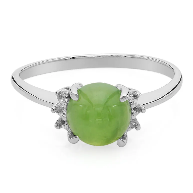 Entdecken Sie die Eleganz dieses atemberaubenden Rings mit einem runden Chrysopras-Cabochon von 0,97 Karat aus Australien, der von sechs funkelnden brasilianischen weißen Topas-Steinen wunderbar ergänzt wird. Der Ring ist aus 925er Sterlingsilber gefertigt und wiegt ca. 1,25 g. Er eignet sich sowohl für legere als auch für formelle Anlässe und passt perfekt zu einem schicken Kleid oder einer klassischen Abendgarderobe und verleiht jedem Outfit einen Hauch von Eleganz.