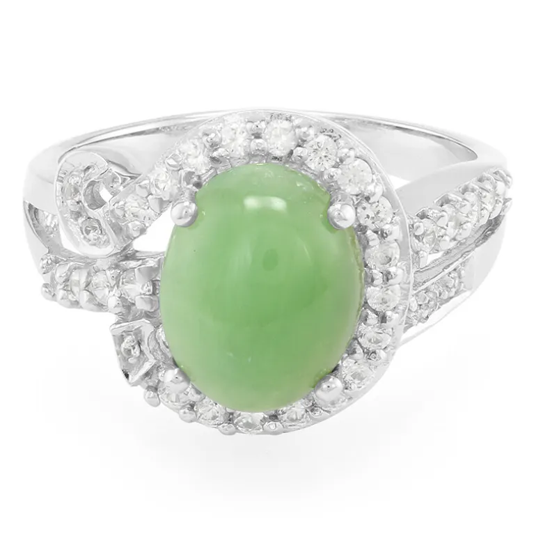 Entdecken Sie die Anziehungskraft dieses atemberaubenden ovalen Chrysopras-Cabochons, der von funkelnden Zirkon-Akzenten aus Kambodscha umrahmt wird. Der leuchtende australische Edelstein von 2,22 Karat ist das Herzstück dieses zeitlosen Designs aus 925er Sterlingsilber und wiegt beachtliche 3,53 Gramm. Dieser elegante Ring präsentiert nicht nur den leuchtend grünen Farbton des Chrysopras, sondern auch die Brillanz von 31 fein geschliffenen Zirkonen, die ihm ein Gesamtkaratgewicht von 2,9 Karat verleihen. Seine raffinierte Ästhetik macht ihn zu einer vielseitigen Wahl, egal ob Sie sich für eine formelle Veranstaltung herausputzen oder Ihrer Alltagskleidung einen Hauch von Klasse verleihen wollen.