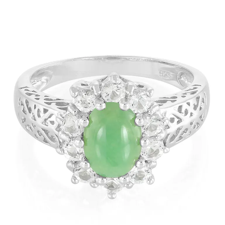 Mit einem wunderschönen ovalen australischen Chrysopras im Cabochon-Schliff ist dieser raffinierte Ring ein Zeugnis der Eleganz. Eingerahmt von funkelnden weißen Topasen mit einem Gesamtgewicht von 0,775 ct, strahlt der zentrale Edelstein in einem leuchtenden, satten Grünton. Er ist aus 925er Sterlingsilber mit einem filigranen Design gefertigt und wiegt ca. 2,81 g. Die Kombination aus exquisiten Edelsteinen und Silber macht ihn zu einem modernen und stilvollen Schmuckstück, das jedem Outfit einen Hauch von Brillanz verleiht. Er eignet sich perfekt für besondere Anlässe oder für das tägliche Tragen und wird aufgrund seiner Farbe und seiner Handwerkskunst mit Sicherheit Bewunderung hervorrufen.