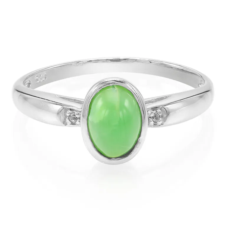 Entdecken Sie die Anziehungskraft des ovalen Chrysopras-Cabochon-Silberrings, eines Schmuckstücks, das lebhafte Eleganz und subtile Raffinesse nahtlos miteinander verbindet. Der australische Chrysopras mit einem Gewicht von 0,52 Karat wird durch zwei brasilianische Weißtopase mit einem Gewicht von 0,008 Karat anmutig ergänzt. Dieser Ring aus Sterlingsilber eignet sich sowohl für den Alltag als auch für besondere Anlässe und lässt sich sowohl mit legeren als auch mit formellen Outfits wunderbar kombinieren.