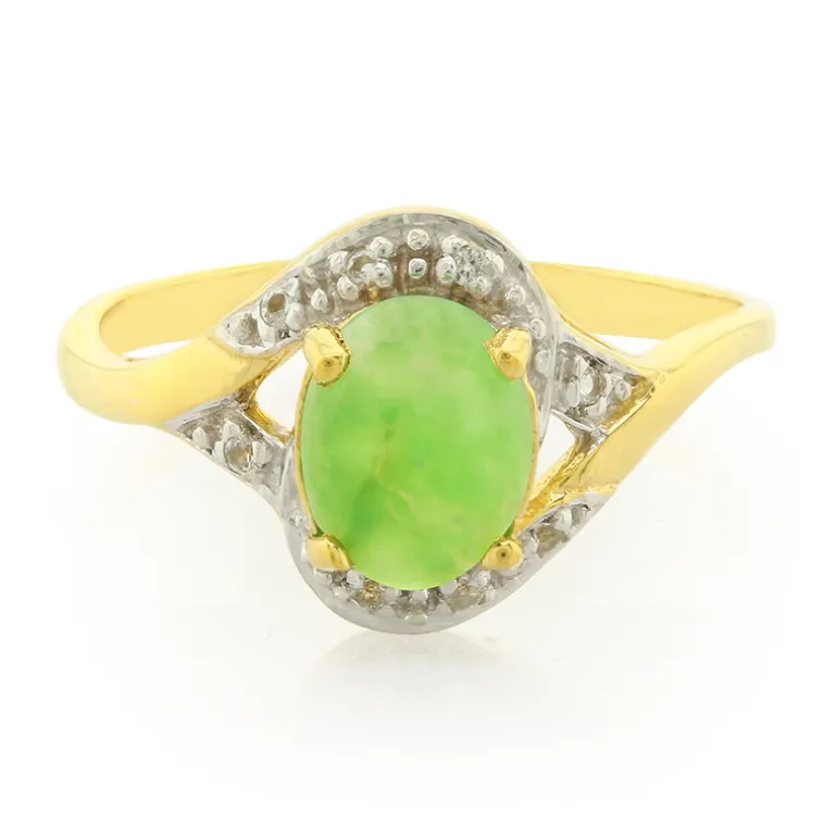 Entdecken Sie Eleganz mit diesem atemberaubenden Chrysopras-Silberring. Der Ring mit einem australischen Chrysopras-Cabochon von 0,58 Karat, der von acht funkelnden brasilianischen Weißtopasen akzentuiert wird, ist elegant in vergoldetes 925er Sterlingsilber gefasst. Er eignet sich perfekt, um jedem Outfit einen Farbakzent zu verleihen, und kann sowohl tagsüber als auch abends getragen werden. Ein luxuriöses Stück für Schmuckliebhaber, die Raffinesse und Charme suchen.