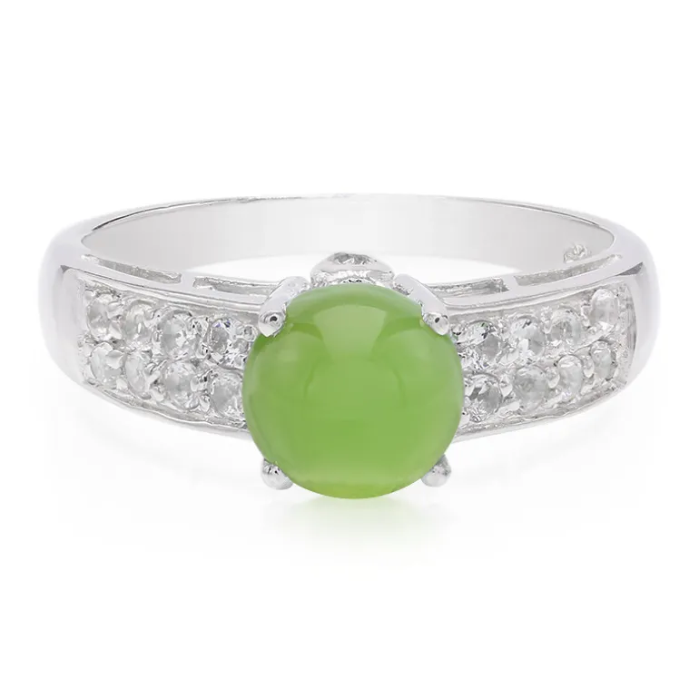Dieser Ring schmückt Ihre Hand mit einem Hauch von Eleganz. Er zeigt einen atemberaubenden australischen Chrysopras im Cabochon-Schliff, ergänzt durch ein funkelndes Gefolge aus brasilianischen Weißtopasen. Das Band aus 925er Sterlingsilber bildet einen schimmernden Kontrast. Sein modernes Design macht ihn vielseitig einsetzbar und passt sowohl zu legerer Kleidung als auch zu eleganten Ensembles.