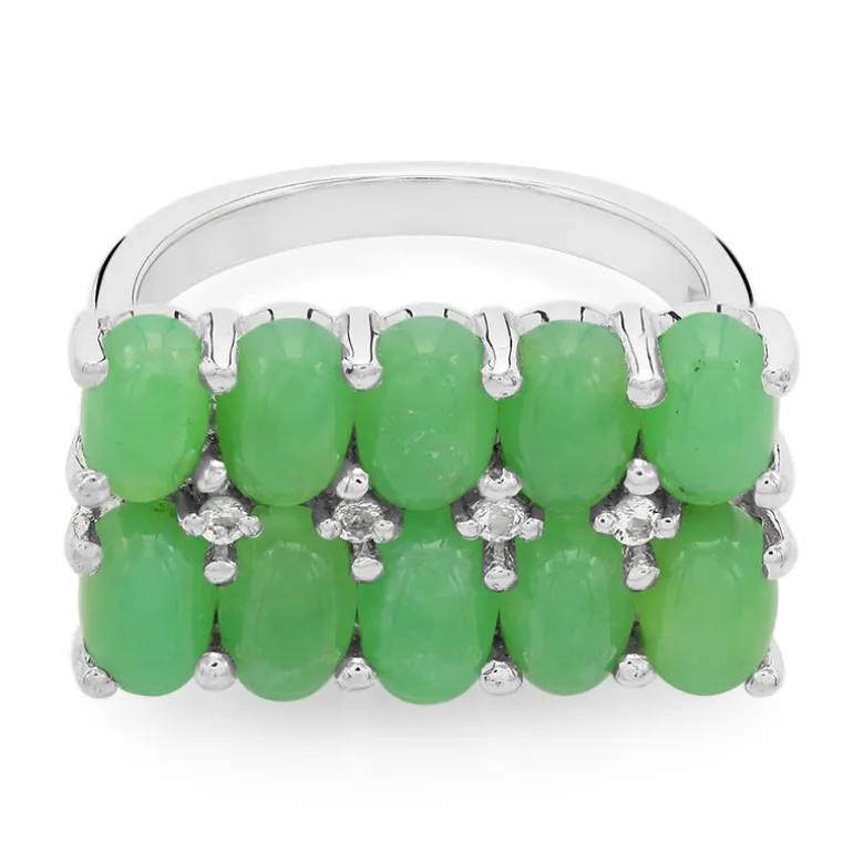 Entdecken Sie den grünen Charme dieses Rings aus Sterlingsilber, der zehn ovale australische Chrysopras in Cabochon-Form präsentiert. Ergänzt durch funkelnde brasilianische Weißtopase ist dieses 3,37-karätige Stück eine Geschichte von natürlicher Schönheit und subtilem Glamour. Mit einem Gesamtgewicht von fast 4,5 Gramm ist dieser Ring ein Statement für die Eleganz des Tages oder die Raffinesse des Abends. Betrachten Sie diesen Ring als frischen Akzent zu einem Sommerkleid oder als Farbakzent zu neutraler Kleidung.