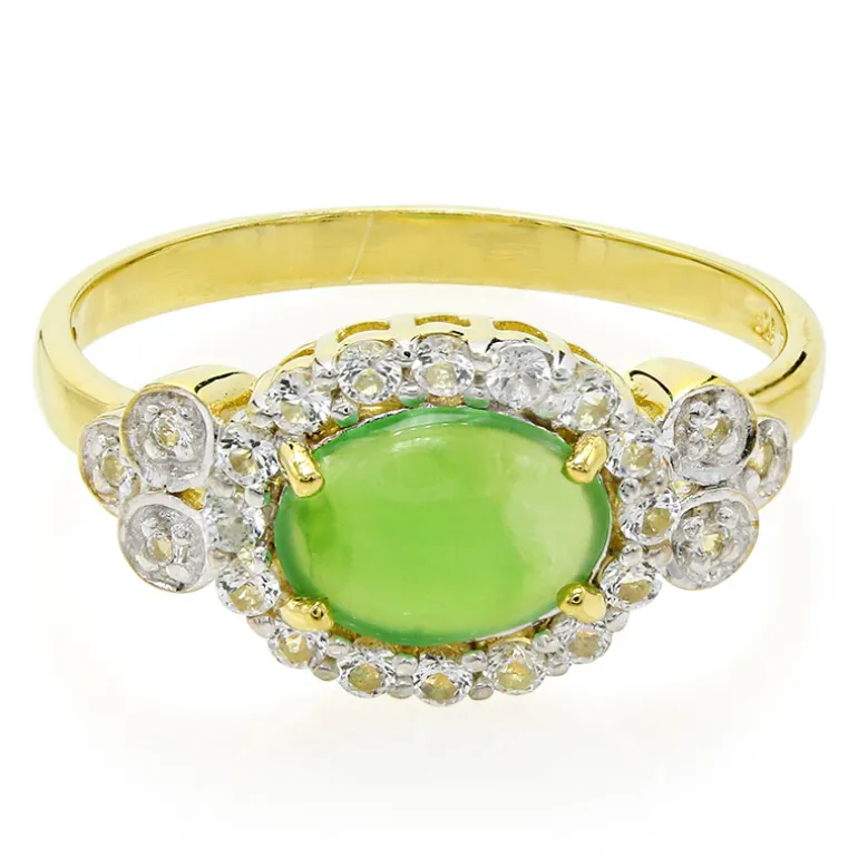 Entdecken Sie Eleganz mit diesem atemberaubenden Chrysopras-Ring mit einem ovalen Cabochon von 0,5 Karat aus Australien. Akzentuiert mit brasilianischem Topas im Brillantschliff, strahlt er Raffinesse aus. Die vergoldete Fassung aus Sterlingsilber unterstreicht seine luxuriöse Ausstrahlung. Perfekt für formelle Anlässe oder als schickes Accessoire zu Freizeitoutfits. Ein Meisterwerk für jede Schmucksammlung.