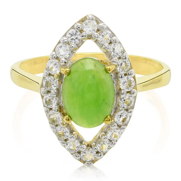 Dieser exquisite Ring zeigt einen leuchtenden australischen Chrysopras-Cabochon, der elegant von brillanten brasilianischen Topas-Akzenten umgeben ist. Der Ring aus vergoldetem 925er Sterlingsilber ist ein echter Blickfang und eignet sich sowohl für den Alltag als auch für besondere Anlässe. Kombinieren Sie ihn mit einem klassischen schwarzen Kleid oder einem schicken Abendoutfit, um ein Statement zu setzen.